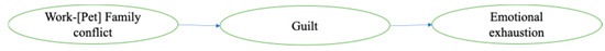 Although the relationship between work–family conflict and guilt has been empirically demonstrated [16,17,18], to the best of my knowledge, scarce studies have investigated this relationship within the context of families with pets (see an exception, Kogan et al. [9,13]). As a result, work–pet family conflict has been largely overlooked [8,13]. Therefore, drawing on role theory, this study aims to expand the understanding of work–family conflict by examining its implications for families with pets. Specifically, it explores whether and how work–pet family conflict contributes to emotional exhaustion through the elicitation of guilt (see Figure 1).