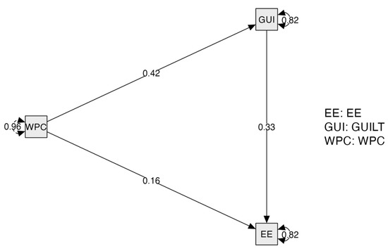 In the proposed mediating model (see Figure 1), there were three types of variables: (1) predictor (work–pet family conflict); (2) one criterion variable (emotional exhaustion); and (3) one mediator (guilt). SPSS 28.0 and the software JASP (version 0.14.1) were used to test the proposed research model. First, descriptive analysis was conducted to calculate the mean and standard deviation for each variable. Second, correlational analyses were performed to examine whether work modality was associated with the mediator and the criterion variables. Third, the measurement model’s goodness of fit was evaluated. In this regard, we found that the Root Mean Square Error of Approximation (RMSEA) < 0.08, Standardized Root Mean Squared Residual (SRMR) < 0.08, Comparative Fit Index (CFI) > 0.90, and Tucker–Lewis Index (TLI) > 0.90 evidenced a good fit [54].
