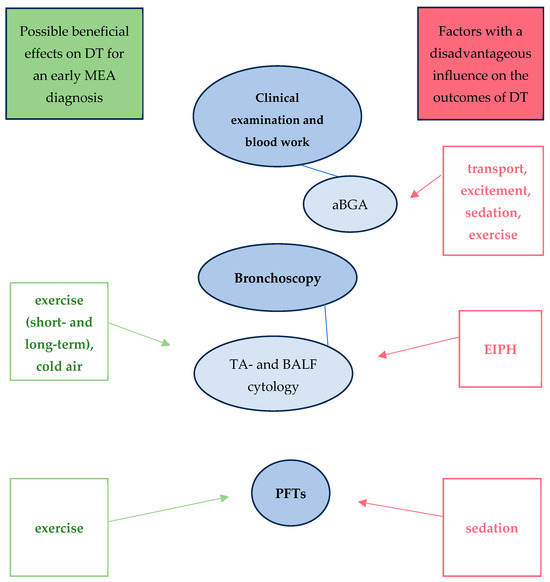Different factors influencing the techniques used for EA diagnostics. Blue: selection of techniques used for EA diagnostics, the results of which can be affected by a number of variables. Red: factors whose influence can lead to a distortion of the results of these diagnostic techniques. Green: factors which have the potential to influence diagnostic techniques in a manner that may facilitate an earlier diagnosis of MEA. DT: diagnostic techniques, PFTs: pulmonary function tests.