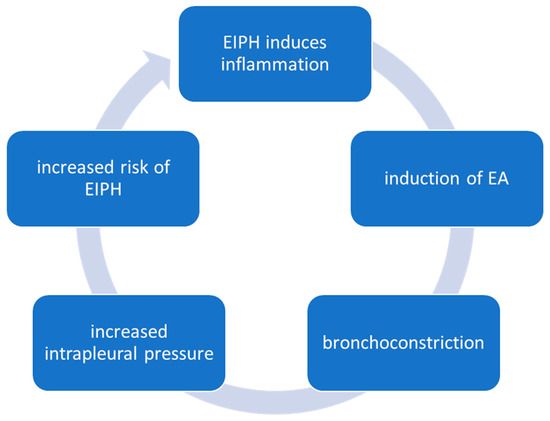 Hemosiderophages can also be detected in the BALF of asthmatic horses, in addition to horses suffering from EIPH, especially racehorses, that are exposed to intense exercise. The quantity of hemosiderophages found in BALF is positively correlated with the severity of EA [106]. Leucocyte counts from BALF cytology in EA, EIPH, or combined disease show no significant differences. The inflammatory response appears to be similar, with one disease possibly causing the other. The pathomechanism of this mutual influence between EIPH and EA is based on bleeding in the lungs, which causes an inflammatory response. This inflammatory response can induce equine asthma (Figure 2). The resulting bronchoconstriction leads to an increased intrapleural pressure, which in turn increases the risk of EIPH [107]. Experimentally induced pneumonia also increases the risk of EIPH [108]. This is due to the altered vascular permeability caused by the inflammation. In the case of severe exercise, the increase in blood pressure is an important cause of EIPH. Angiogenesis and fibrosis induced by inflammation exacerbate the situation [109].