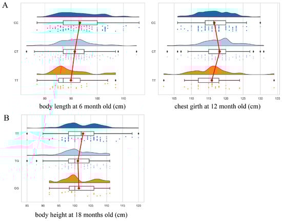 The results of the association analysis between the g.55,999,531C>T locus and growth traits of the Ashidan yaks are shown in Table 3. The results showed that this locus was significantly correlated with body length and chest circumference of the Ashidan yaks (p < 0.05). The body length of the CC genotype was significantly higher than that of the TT genotype at 6 months. The chest circumference of the 12-month-old CT genotype individuals was significantly higher than that of the TT genotype individuals.