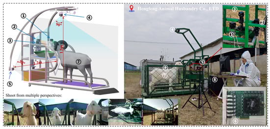 The experiment of this study was approved by the Experimental Animal Welfare Ethics Committee of Anhui Agricultural University (Animal welfare ethical number: AHAUXMSQ2023123). The experiment was conducted from November 11th to 25th, 2023, at Hengfeng Animal Husbandry Co., Ltd., in Yuanzhuang Village, Zhangguan Town, Linquan County, Fuyang City, Anhui Province, China (32°54′12″ N, 115°18′40″ E). A total of 80 Wanlin white goats with very similar appearance of 6~8 months of age, with an average weight of approximately 30 kg, were employed. Five types of appearance images of every goat were captured using the platform shown in