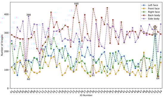 Figure 2. Among them, there were 8465 images of the left face, 5779 images of the front face, 8336 images of the right face, 16,334 images of the back body, and 5323 images of the side body, showing severe imbalance in the number of various appearance images of different goats (with the highest number of side body images for goat 0024, reaching 448; and the fewest front face images for goat 0007, only 60). To balance the number of samples in each class to avoid model bias and improve the generalization ability of the model, this study used image augmentation techniques to expand the images of each type of appearance of each goat, as shown in