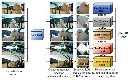 In this study, the self-trained YOLOv8n model was used to automatically locate the appearance image of the goat from the image extracted from the video as the region of interest (ROI). These ROIs were extracted and resized to the currently dominant 224 × 224 pixel size and then fed into the single appearance recognition or decision fusion recognition classification model to recognize the identity of the goat individual, as shown in