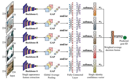 Figure 5, one branch is used to process the left side face image features; another branch is used to process the front face image features; and the other branches are used to process the right side face, back body, and side body image features. Each branch network processes the input goat appearance image independently, and its feature map (or feature tensor) is converted into a fixed-length feature vector through global average pooling and then passed into the fully connected layer for further processing. The output of the fully connected layer was processed by a softmax function to obtain the confidence vector (length 54, each data value is in the interval [0, 1]). The confidence vector of each type of appearance image is multiplied by the accuracy of the single appearance model whose appearance corresponds (i.e., the accuracy value metrics from the corresponding base model above) to obtain the weight vector. The average value of the five weight vectors is calculated to be the predicted probability vector for the identity of the goat individual under the fusion of the five appearances (the length is 54), as shown in Equation (8). The index of the largest value in this probability vector corresponds to the goat’s identity number predicted by the model. The above fusion model can utilize different goat appearance information by multiple branch networks, which theoretically performs better.