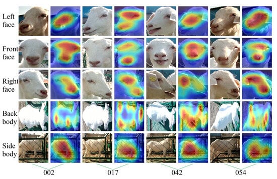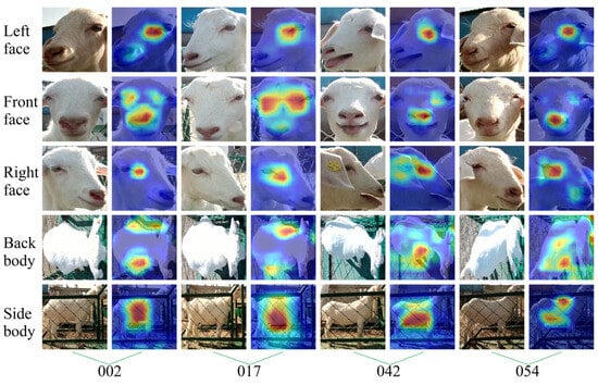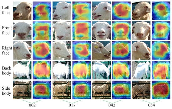 The attention to goat appearance in each goat’s identification model was analyzed to further reveal the parts of appearance features extracted by different models for different appearance images of goats when recognizing the individual identity of goats. This study randomly selected four goats (ID: 0002, 0017, 0042, 0054, respectively), using the Grad-CAM++ visualization model on their identity recognition process, as shown in