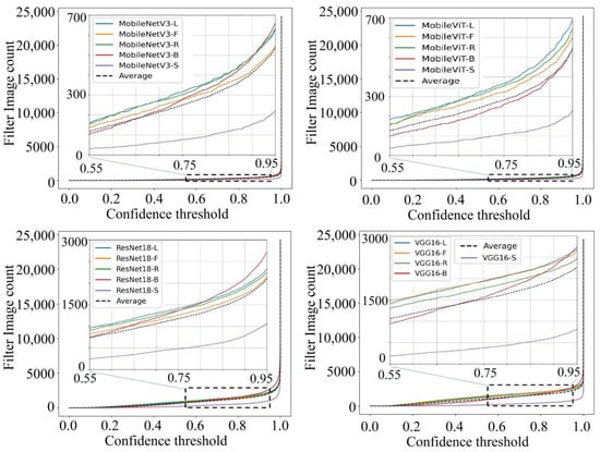 Figure 15. It can be seen that in MobileNetV3 and MobileViT single appearance recognition models using training image prediction, the number of images with Top-1 confidence thresholds lower than 0.9 accounted for less than 2% of the total number of images, and lower than 0.6 accounted for less than 1% on average. In ResNet18 and VGG16 single appearance recognition models using training image prediction, the average number of images with a Top-1 confidence threshold lower than 0.9 was less than 8% of the total number, and lower than 0.6 was less than 5%. Most training images were predicted to have Top-1 confidence thresholds close to 1 for all the goats’ single appearance recognition models. This indicates that the vast majority of images in the training set were predicted with high confidence. This suggests that by setting a reasonable Top-1 confidence threshold, the performance of the recognition model using a single appearance can be improved with the assurance of filtering out a smaller number of images under accuracy.