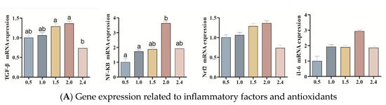 The gene expression levels related to inflammatory factors, antioxidants, and lipid metabolism are presented in Figure 5A and Figure 5B, respectively. The expression levels of the transforming growth factor beta (TGF-β) in the spleens of fish fed diets containing 1.5% and 2.0% n-3 HUFA were significantly elevated compared to those fed a diet with 2.4% n-3 HUFA (p < 0.05). Additionally, no statistically significant differences were observed in TGF-β expression among fish fed diets with 0.0%, 1.0%, 1.5%, and 2.0% n-3 HUFA (p > 0.05). The expression of nuclear factor kappa-B (nf-κB) in the spleen of fish fed a diet containing 2.0% n-3 HUFA was significantly elevated compared to those fed diets with 0.5% and 1.0% n-3 HUFA (p < 0.05). The expression of the nuclear factor erythroid-2-related factor (Nrf2) and interleukin-6 (Il-6) in the spleen were not affected by the dietary n-3 HUFA contents (p > 0.05).