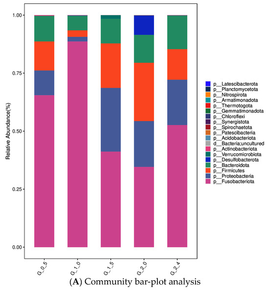 Furthermore, the intestinal microbiota of the different groups was investigated at both the phylum and genus levels (Figure 6). At the phylum level, the dominant phylum in the G_0.5 group was Fusobacteriota (65%), followed by Firmicutes (13%), Proteobacteria (11%), and Bacteroidota (11%); in the G_1.0 group, it was Fusobacteriota (89%), followed by Firmicutes (3%), Proteobacteria (2%), and Bacteroidota (6%); in the G_1.5 group, it was Fusobacteriota (41%), followed by Firmicutes (19%), Proteobacteria (27%), and Bacteroidota (11%); in the G_2.0 group, it was Fusobacteriota (35%), followed by Firmicutes (25%), Proteobacteria (20%), Desulfobacterota (8%), and Bacteroidota (12%); in the G_2.4 group, it was Fusobacteriota (53%), followed by Firmicutes (13%), Proteobacteria (20%), and Bacteroidota (14%) (Figure 6A). The results indicated that Fusobacteriota, Firmicutes, Bacteroidota, and Proteobacteria were the four most abundant bacterial phyla in the intestines of Yangtze sturgeon across the five groups. Based on the comparison of microbiota taxa at the genus level, the primary genera in the G_0.5 group was found to be g_Cetobacterium (65.47%), followed by o_Bacteroidales (8.1%), g_Clostridium_sensu_stricto_1 (7.82%), and g_Aeromonas (4.21%). In the G_1.0 group, it was g_Cetobacterium (88.54%), followed by g_Bacteroides (4.80%). In the G_1.5 group, it was g_Cetobacterium (40.86%), followed by f_Lachnospiraceae (7.05%), g_Stenotrophomonas (24.58%), and g_Chryseobacterium (7.07%). In the G_2.0 group, it was g_Cetobacterium (34.23%), followed by g_Clostridium_sensu_stricto_1 (14.19%), g_Bacteroides (8.68%), g_Stenotrophomonas (13.98%), and f_Desulfovibrionaceae (8.28%). In the G_2.4 group, it was g_Cetobacterium (51.79%), followed by g_Bacteroides (10.47%) and g_Stenotrophomonas (14.47%) (Figure 6B).
