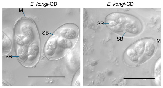 - Cui, P.; Liu, H.; Fang, S.; Gu, X.; Wang, P.; Liu, C.; Tao, G.; Liu, X.; Suo, X. A new species of Eimeria (Apicomplexa: Eimeriidae) from Californian rabbits in Hebei Province, China. Parasitol. Int. 2017, 66, 677–680. [Google Scholar] [CrossRef]