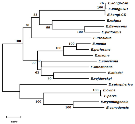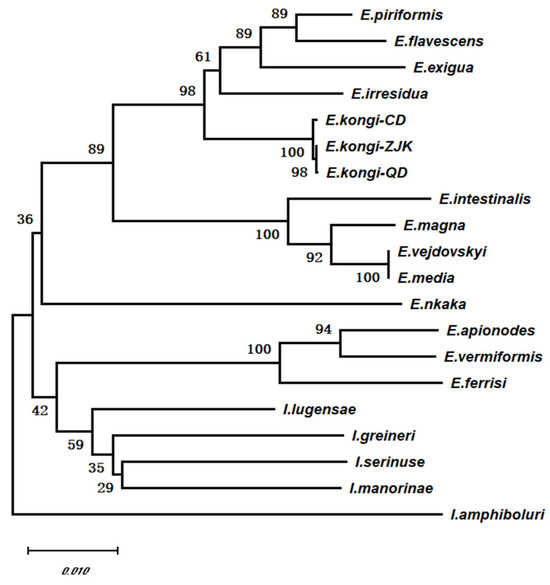 - Shi, Y.; Fang, S.; Gu, X.; Hao, C.; Du, F.; Cui, P.; Tang, X. The Complete Mitochondrial Genome Sequence of Eimeria kongi (Apicomplexa: Coccidia). Life 2024, 14, 699. [Google Scholar] [CrossRef]