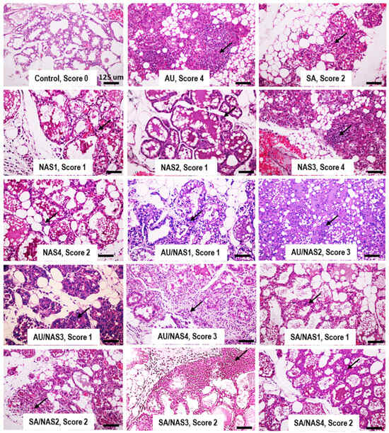 Figure 2. Pathohistological features and scores of the murine mammary glands at 72 h after the experimental IMIs: either the single IMIs with S. aureus (AU), S. agalactiae (SA), S. hominis (NAS1 and NAS2), and S. chromogenes (NAS3 and NAS4), or the mixed IMIs with AU and SA together with NAS1–NAS4. The details of the scores are described in Figure 2. The arrows indicate the leukocyte influx.