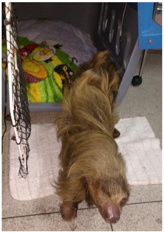 Throughout the five years, the animal was housed in a specific area for wild mammals, in a transport box (84 cm × 73 cm × 60 cm) with exposure to natural ultraviolet light, lined with soft fabrics and pillows. The enclosure was cleaned daily and washed and dried weekly, and the fabrics and pillows were replaced regularly. The animal was kept isolated from other species, without direct contact with other animals. The ambient temperature ranged from 23 °C to 35 °C, with an average humidity of 70%.