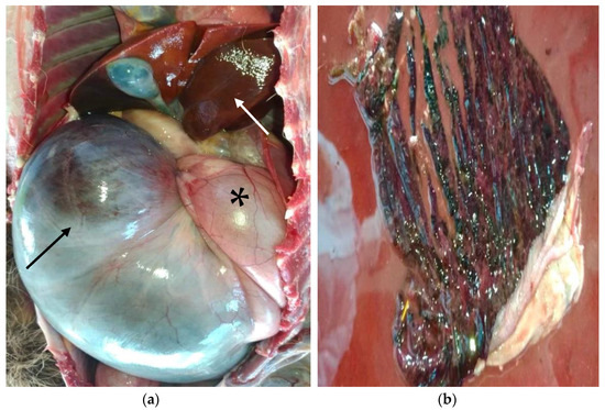Macroscopic findings. (a) Distension of the squamous gastric compartment due to the presence of air (*), with a distended, purple–black glandular stomach (black arrow) and hepatic displacement (white arrow). (b) Severe hemorrhage and necrosis of the glandular stomach mucosa, accompanied by a large quantity of reddish liquid content.