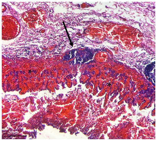 Histopathological examination (H&E obj. 10×). Marked congestion with mucosal hemorrhage and necrosis (*), along with the formation of tertiary lymphoid follicles (black arrow).