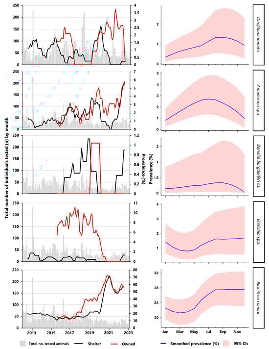 - Petruccelli, A.; Ferrara, G.; Iovane, G.; Schettini, R.; Ciarcia, R.; Caputo, V.; Pompameo, M.; Pagnini, U.; Montagnaro, S. Seroprevalence of Ehrlichia spp., Anaplasma spp., Borrelia burgdorferi sensu lato, and Dirofilaria immitis in Stray Dogs, from 2016 to 2019, in Southern Italy. Animals 2021, 11, 9. [Google Scholar] [CrossRef]