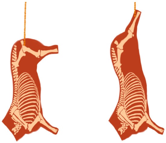 The animals were stunned in the frontal head area with a captive bolt stunner, slaughtered, and trimmed by the current EU regulations [35]. Before entering the chilling room, the carcasses were divided longitudinally into two halves. One half of each carcass was suspended using the conventional method (Achilles tendon; AT), where the hanging hook is positioned through the hind heels, while the other side of the carcass was suspended by the pelvic bone (tenderstretch; TS; see Figure 1). The TS method consisted of the following procedure: the half-carcasses were lifted using a manual tackle and an S-shaped hook was inserted into the foramen obturator so that the hind limb hung in a horizontal position of approximately 90° to the carcass. According to commercial practice, the carcasses were placed in a refrigerated chamber at 4 °C and aged for 7 days. After the aging period, the M. longissimus dorsi (LD) and M. semitendinosus (ST) were removed from each half-carcass. The samples were then immediately transported to the laboratory of the Department of Animal Science at the Biotechnical Faculty (University of Ljubljana, Slovenia) for further analysis.