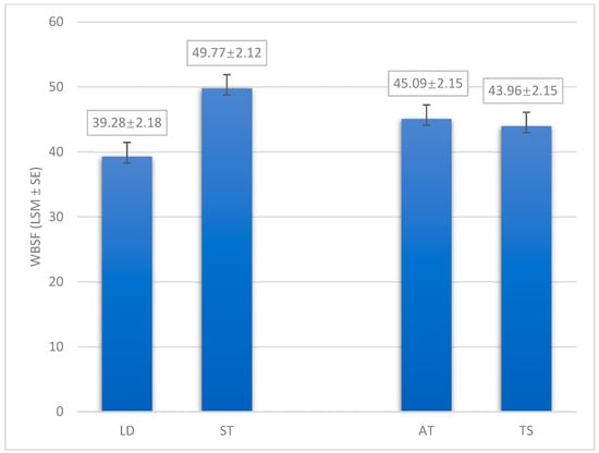 The effect of muscle and suspension method on the Warner–Bratzler shear force (LSM ± SE). LT = longissimus dorsi muscle; ST = semitendinosus muscle; AT = Achilles tendon method, TS = tenderstretch method; WBSF = Warner–Bratzler shear force.