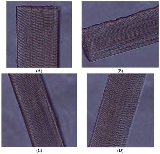 The samples for measuring sarcomere length were prepared as described by Hegarty and Naudé [38]. For this purpose, the muscles were frozen in a cryostat (Leica CM1850, Nussloch, Germany). An approx. 200 µm thick slice was cut, removed, and homogenized in 1 mL Ringer’s solution using a laboratory blender (T 18 basic ULTRA-TURRAX, IKA, Staufen, Germany). A small drop of the homogenized sample was observed with a microscope (Leica DM750, PR, Leica Microsystems GmbH, Wetzlar, Germany) equipped with a camera (Leica ICC50 HD, Leica Microsystems GmbH, Wetzlar, Germany). Within each prepared sample, the photos of 10 myofibers were taken from the randomly selected areas. The Micro-manager V 2.0. program was used to determine sarcomere length. Within each myofiber, the sarcomere length was measured on 10 myofibrils, and a median value of one hundred measurements was used for further analysis.