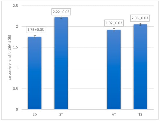 Postmortem sarcomere lengths have a significant effect on the texture of raw and cooked meat, directly influencing the WHC of raw meat, and indirectly affecting the color, taste, and other meat quality attributes [25]. Transmission light micrographs (Figure 3) reveal variations in sarcomere length between LD and ST muscles, as well as variations in suspension methods. The further analysis of the results show a significant difference between LD and ST muscles in sarcomere length (p < 0.0001; Figure 4). The estimated difference in sarcomere length between the muscles shows that the ST muscle is 0.48 μm longer than the LD muscle. Sarcomere length decreases with muscle contraction, and following rigor, significant variation in sarcomere length can occur both within and between muscles [25]. Locker [62], for example, found that sarcomere lengths in different bovine muscles varied between 0.7 and 3.7 µm after rigor.
