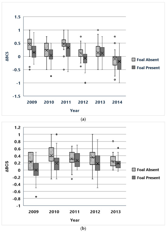 Boxplots of the changes in body condition scores (ΔBCS) across the summer field season in mares with and without foals. BCS values range from 1 to 5 (after [26]), recorded in half-unit increments. (a) Cedar Mountain HMA, UT, USA, 2009–2014. (b) Sand Wash Basin HMA, CO, USA, 2009–2013.