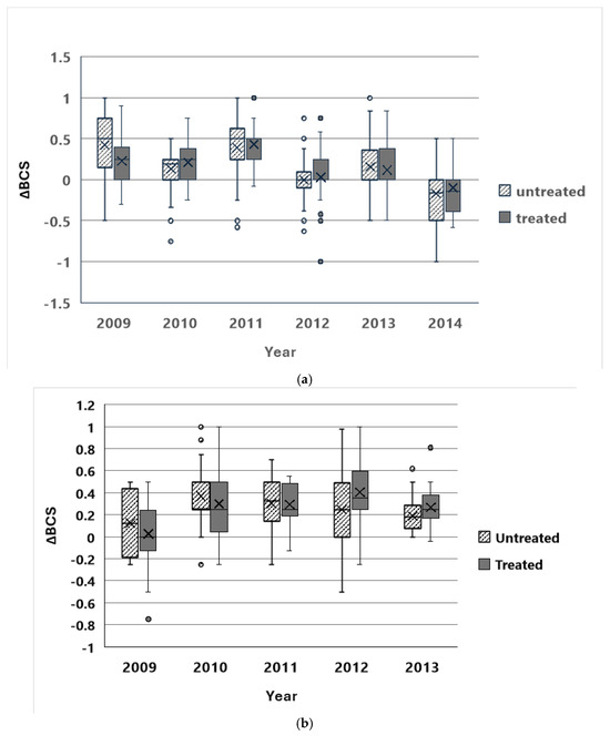 Boxplots of the changes in body condition scores (ΔBCS) across the summer field season in PZP-treated mares and untreated mares. BCS values range from 1 to 5 (after [19]), recorded in half unit increments. (a) Cedar Mountain HMA, UT, USA, 2009–2014. (b) Sand Wash Basin HMA, CO, USA, 2009–2013.
