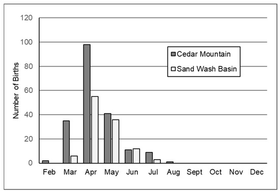 Distribution of births from 2008 to 2009 (pooled) at Cedar Mountains HMA, UT, USA, and Sand Wash Basin HMA, CO, USA. Births during these years were not affected by the initial PZP-22 treatments delivered in December 2008 at CM and October 2008 at SWB.