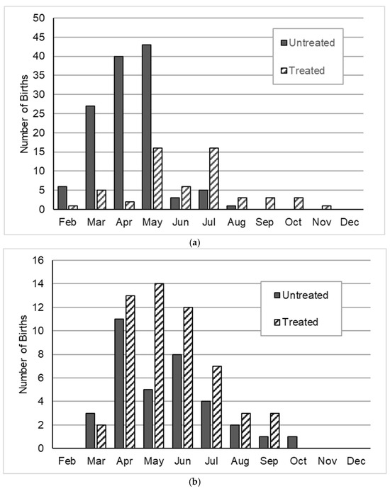 Distribution of births for untreated mares and treated mares following initial PZP-22 injections, 2010–2011 pooled. (a) Cedar Mountains HMA, UT, USA; (b) Sand Wash Basin, CO, USA.