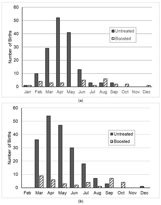 Distribution of births following booster treatments of PZP. (a) Cedar Mountains HMA, UT, USA, 2013–2015; boosted February 2012. (b) Sand Wash Basin HMA, CO, USA, 2012–2014; boosted autumn 2010.
