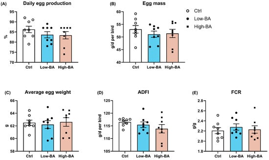 Effects of dietary bile acid (BA) supplementation on production performance in late-phase laying hens. (A) Daily egg production, (B) egg mass, (C) average egg weight, (D) average daily feed intake (ADFI), and (E) feed conversion ratio (FCR). Egg mass was derived by multiplying the egg production rate (%) by the average egg weight (g). FCR was determined by dividing the feed consumption by the total egg weight per replicate. p < 0.05 was set as statistically significant (n = 8).