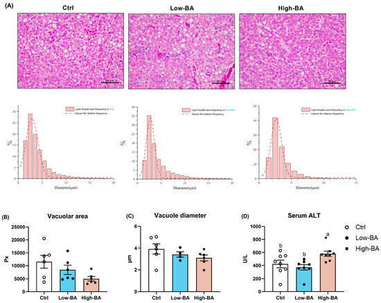 Figure 3A showed the presence of lipid droplet vacuoles in all treatment groups, accompanied by the compression of hepatocyte nuclei, according to H&E staining. The supplementation of BAs increased the particle size distribution from 2 to 4 μm in the Ctrl group to 3–5 μm in both the Low- and High-BA groups, respectively (Figure 3A). The analysis indicated that both the diameter and area of vacuoles tended to decrease as the BAs levels increased (Figure 3B,C). Moreover, a high dietary BA treatment notably elevated serum ALT levels compared to Ctrl and Low-BA groups (p > 0.05, Figure 3D).