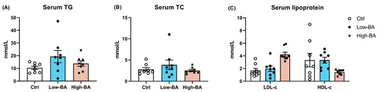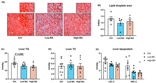 There were no significant changes following BA treatment regarding TG, TC, LDL-c, and HDL-c in serum (p > 0.05, Figure 4). In the liver, Oil Red O staining indicated that low levels of BA inclusion reduced lipid deposition in hepatic tissues compared to the Ctrl and High-BA groups (p > 0.05, Figure 5A,B). Furthermore, the TG level in the High-BA group was significantly decreased compared to the Ctrl group (p < 0.05, Figure 5C). However, in the Low-BA group, the TG values were decreased (p = 0.055, Figure 5C). There were no significant changes in the TC content and lipoprotein in the liver with increasing BA dosage (p > 0.05, Figure 5D,E).