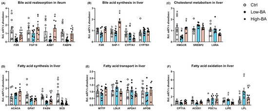 Detection of the gene-related cholesterol metabolism revealed that the supplementation of low BAs reduced (p < 0.05) the expression of 3-hydroxy-3-methyl glutaryl coenzyme A reductase (HMGCR) relative to the Ctrl groups (Figure 6C). The BA manipulation failed to change the transcription of sterol regulatory element-binding transcription factor (SREBP)-2 and nuclear receptor subfamily 1 group H member 3 (LXRA) in the liver (Figure 6C). According to the findings in Figure 6D, the supplementation of BAs decreased the mRNA levels of fatty acid synthase (FASN) and stearoyl-CoA desaturase (SCD) when compared to the Ctrl group. The mRNA abundances of lipid transport genes, including microsomal triglyceride transfer protein (MTTP), low-density lipoprotein receptor (LDLR), apolipoprotein A1 (APOA1), and apolipoprotein B (APOB), were not significantly affected by bile acid treatment (p > 0.05, Figure 6E). Furthermore, the Low-BA administration significantly upregulated the expression of lipase E, hormone-sensitive type (LIPE) relative to the Ctrl group (p < 0.05), and lipoprotein lipase (LPL) slightly increased (Figure 6F). There were no significant differences between the Ctrl and High-BA groups in terms of carnitine palmitoyl transferase 1A (CPT1A), acyl-CoA oxidase 1 (ACOX1), and peroxisome proliferator-activated receptor γ Co activator 1-alpha (PGC1α) according to Figure 6F.
