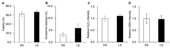 Comparison of viability (A), acrosome reaction (B), intracellular hydrogen peroxide (H2O2) (C), and glutathione (GSH) (D) levels between Duroc sperm (DS) and Landrace sperm (LS). Data are presented as the mean ± standard error mean (n = 10).