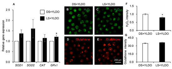The antioxidative enzyme genes, intracellular H2O2, and GSH in the DS+YLDO and DS+YLDO groups are shown in Figure 2. GPx1 mRNA was significantly higher in the LS+YLDO than DS+YLDO groups (p < 0.05), whereas SOD1, SOD2, and CAT mRNAs showed no significant expression (Figure 2A). The intracellular H2O2 intensity (Figure 2B,C, green) was significantly (p < 0.05) lower in the LS+YLDO than DS+YLDO groups (Figure 2F); however, there was no significant difference in GSH levels (Figure 2D,F, red; Figure 2G).