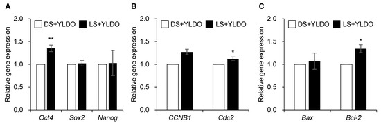The expression of Oct4 mRNA was significantly higher in the LS+YLDO than DS+YLDO groups (p < 0.05); however, for the other pluripotency genes, Sox2 and Nanog, mRNAs did not significantly differ (Figure 3A). In addition, the expression of Cdc2 mRNA was significantly increased in the LS+YLDO group (p < 0.05); however, CCNB1 mRNA levels did not differ between the DS+YLDO and LS+YLDO groups (Figure 3B). Lastly, the expression of Bcl-2 mRNA was significantly improved in the LS+YLDO group compared with that in the DS+YLDO group (p < 0.05). In contrast, the expression of Bax mRNA did not change (Figure 3C).
