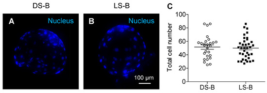 A comparison of the total number of blastocysts produced in vitro is shown in Figure 4. The total cell number of blastocysts showed no significant difference (Figure 4C) between DS-B (51.56 ± 3.26 cells, Figure 4A) and LS-B (49.97 ± 2.65 cells, Figure 4B) in pigs.