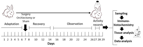 For the gonadectomized group (GDX n = 24), rabbits were anesthetized and underwent gonadectomy. Following surgery and a six-day recovery period, locomotor activity was recorded. The data considered for the analysis were from days 27 and 28. After this period, the rabbits were perfused at 4 h intervals over a 24 h cycle (n = 4 per interval), starting at ZT03 (10:00 h). In the control group (Sham n = 24), rabbits were housed and manipulated like the GDX, including surgery without the removal of the testicles. The control animals were also given a 6-day recovery period before resuming locomotor activity monitoring (Figure 1). The surgeries were performed by a specialized veterinarian. All experimental procedures were carried out in accordance with the procedures of the National Guide for the Production, Care, and Use of Laboratory Animals (Norma Oficial Mexicana NOM-062-ZOO-1999) [25], which complies with the International Guidelines laid down by the Society for Neuroscience, and approved by the technical committee of the Biomedical Research Center, No. 005/2012.
