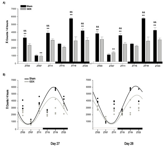 On day 28, two-way ANOVA revealed a similar significant effect of time in the Sham (F 5,23 = 62.029, p < 0.001) and GDX (F 5,23 = 6.420, p < 0.001) groups, with similar significant differences between time points on day 27. Additionally, locomotor activity in the Sham animals was higher at night, whereas the GDX group showed a decrease in locomotor activity. On both days, the Sham group activity at ZT03, ZT11, ZT19, and ZT23 was significantly higher than that in the GDX group (p < 0.01 in all cases). No significant differences were observed at ZT07 or ZT15 (p > 0.05; Figure 2A).