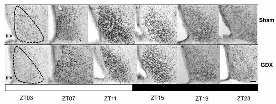 - Iwahana, E.; Karatsoreos, I.; Shibata, S.; Silver, R. Gonadectomy reveals sex differences in circadian rhythms and suprachiasmatic nucleus androgen receptors in mice. Horm. Behav. 2008, 53, 422–430. [Google Scholar] [CrossRef]