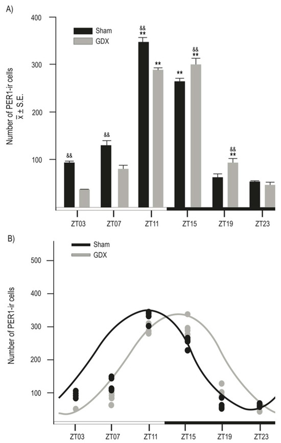 Rhythmic expression of PER1-ir cells in male rabbits. (A) Number of PER1-ir cells in Sham and GDX groups at six different time points throughout complete 24 h cycle. && p < 0.01 indicates differences in peak values between groups at corresponding ZT. ** p < 0.001 indicates differences between higher and lower values within same group (see text for details). Values are presented as mean ± SEM. Black and white bar at bottom represents light/dark (LD) condition. (B) Cosinor analysis indicates significant rhythmicity of PER1-ir cells in both Sham and GDX groups with four-hour delay (p < 0.001); grey and black circles represent individual value at respective time point.