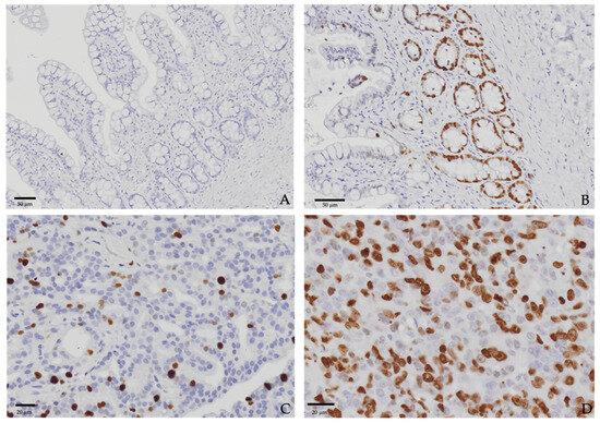All tumor tissues were obtained based on incisional biopsy, fixed in 10% neutral buffer formalin, and embedded in paraffin. Sections (3 μm) were stained using hematoxylin and eosin (H&E). The H&E-stained sections were evaluated by Thai Board-accredited pathologists to diagnose and characterize the morphological descriptions. For immunohistochemistry staining after deparaffinization and rehydration, antigen retrieval involved immersion in a citrate-based buffer containing surfactant (pH 6.0) for 45 min in a vegetable steamer. All sections were blocked for endogenous peroxidase activity and non-specific binding using 3% hydrogen peroxide and 0.4% casein in phosphate-buffered saline (PBS), respectively. Then, the sections were incubated using a mouse anti-Ki-67 monoclonal antibody (clone MIB-1, Dako, Glostrup, Denmark) at a 1:100 dilution in PBS for 60 min at room temperature. The secondary antibody dilution and avidin–biotin complex solution were applied to the sections and incubated for 30 min each at room temperature. Immunolabelling was performed using Novolink Polymer detection (Leica Biosystems, NCL, Newcastle upon Tyne, UK). Finally, the reactions were visualized using DAB as a chromogen; sections were counterstained with hematoxylin. A normal feline intestinal mucosa was used as the positive control, whereas the negative control, as shown in Figure 1, was conducted on slides without the primary antibody [29]. The Ki-67 index was determined by calculating the percentage of Ki-67-positive tumor cells out of 1000 cells, counted across 5 random high-power fields (600×) under microscopic examination. Areas with severe inflammation or necrosis were excluded from the analysis. The Ki-67 index was divided into two groups (high and low Ki-67), with 40% used as the cutoff point, as reported in another study [19].