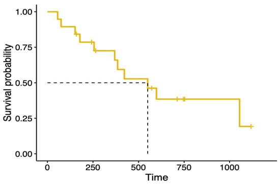 Kaplan–Meier survival curve showing overall median survival of 19 cats with nasal adenocarcinoma treated using hypofractionated RT. The MST was 550 days (range 56–1118 days).