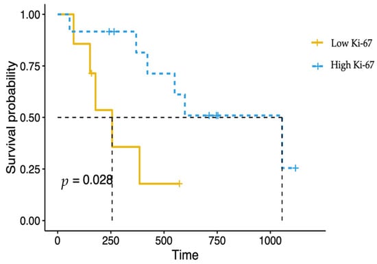 The MST was evaluated across various factors: gender, age, tumor stage, body weight, clinical signs (sneezing, epistaxis, facial deformity, nasal discharge, dyspnea, ocular discharge, upper respiratory noise, submandibular lymph node enlargement), a hematological parameter, a serum biochemistry parameter, radiation dose, and additional RT. However, according to the log-rank test analysis, none of these factors had a significant difference in MST. Notably, cats with high Ki-67 expression had significantly (p = 0.028) longer survival times (1055 vs. 256 days) compared to those with low Ki-67 expression, as illustrated in Figure 3.