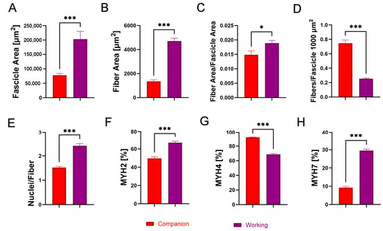 Comparative analysis of (A) fascicle area [µm2], (B) fiber area [µm2], (C) fiber area per fascicle area, (D) fibers per 1000 µm2 of fascicle, (E) nuclei per fiber, (F) percentage of MYH2-immunoreactive (IR) fibers, (G) percentage of MYH4-IR fibers, and (H) percentage of MYH7-IR fibers in the triceps brachii of companion (red) and working (purple) dogs. Asterisks (*) indicate significant differences between companion and working dogs (* p < 0.05, *** p < 0.001).