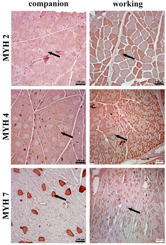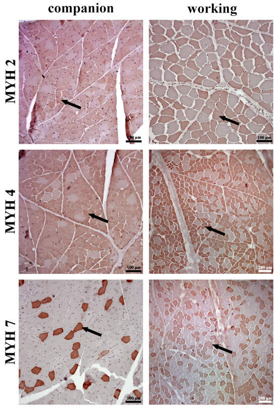 Immunohistochemical staining of muscle fibers in the triceps brachii of companion and working dog breeds, illustrating the distribution of different myosin heavy chain (MYH) isoforms. Staining was performed using DAB as a chromogen. The rows represent different myosin heavy chain isoforms, with MYH2, MYH4, and MYH7 detected in companion and working breeds. Arrows indicate immunoreactive muscle fibers displaying the respective MYH isoform. Scale bars are included in each image for reference (100 µm and 200 µm).