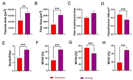 Comparative analysis of (A) fascicle area [µm2], (B) fiber area [µm2], (C) fiber area per fascicle area, (D) fibers per 1000 µm2 of fascicle, (E) nuclei per fiber, (F) percentage of MYH2-immunoreactive (IR) fibers, (G) percentage of MYH4-IR fibers, and (H) percentage of MYH7-IR fibers in the biceps femoris of companion (red) and working (purple) dogs. Asterisks (*) indicate significant differences between companion and working dogs (** p < 0.01, *** p < 0.001).