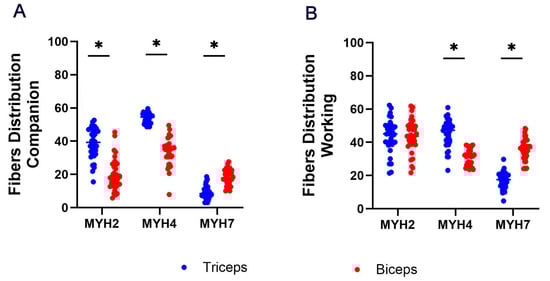 MYH2, MYH4 and MYH7 fiber distribution in triceps brachii and biceps femoris in (A) companion and (B) working dog breeds. Asterisks (*) indicate significant differences between the muscles in fiber distribution (* p < 0.05).