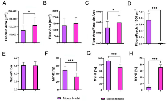 Comparative analysis of (A) fascicle area [µm2], (B) fiber area [µm2], (C) fiber area per fascicle area, (D) fibers per 1000 µm2 of fascicle, (E) nuclei per fiber, (F) percentage of MYH2-immunoreactive (IR) fibers, (G) percentage of MYH4-IR fibers, and (H) percentage of MYH7-IR fibers in the triceps brachii (purple) and biceps femoris (pink) of companion dogs. Asterisks (*) indicate significant differences between triceps brachii and biceps femoris (* p < 0.05, *** p < 0.001).