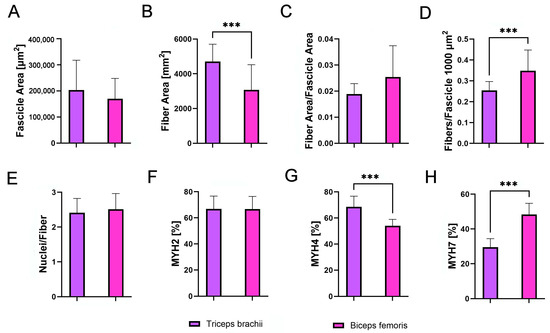 Comparative analysis of (A) fascicle area [µm2], (B) fiber area [µm2], (C) fiber area per fascicle area, (D) fibers per 1000 µm2 of fascicle, (E) nuclei per fiber, (F) percentage of MYH2-immunoreactive (IR) fibers, (G) percentage of MYH4-IR fibers, and (H) percentage of MYH7-IR fibers in the triceps brachii (purple) and biceps femoris (pink) of working dogs. Asterisks (*) indicate significant differences between triceps brachii and biceps femoris (*** p < 0.001).
